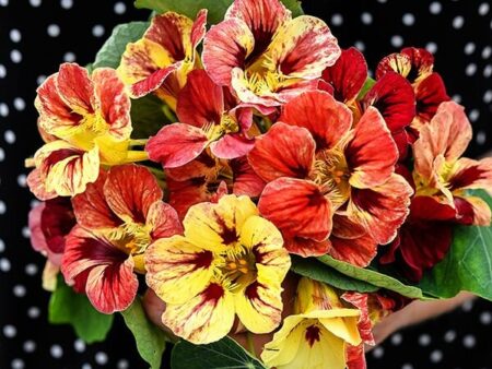 Nasturtium, Bloody Mary. 2″ flowers in dark red, coral red, cream, and unique bicolors. Both mounding and trailing. 16-20″ High. Edible flowers. Fleuroselect award winner.